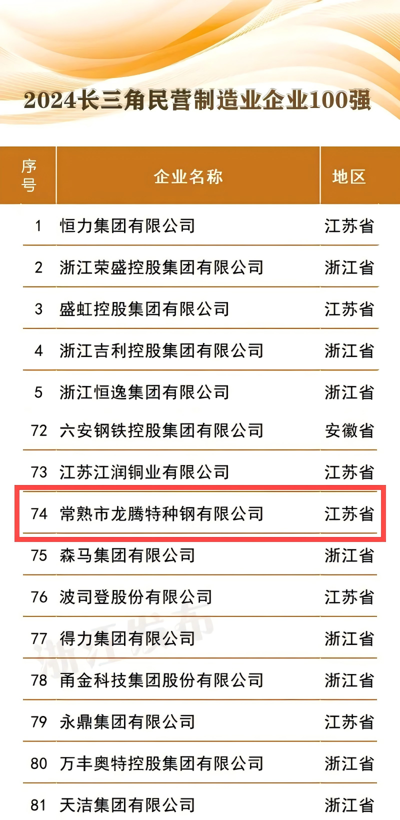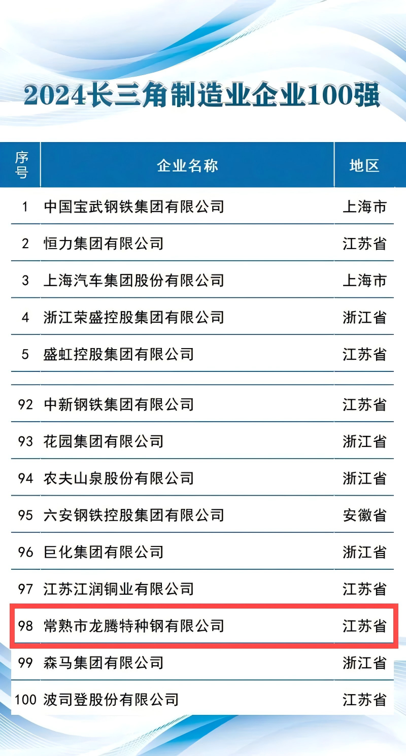 常熟市龍騰特種鋼有限公司位列“2024長三角制造業(yè)企業(yè)100強”第98位;